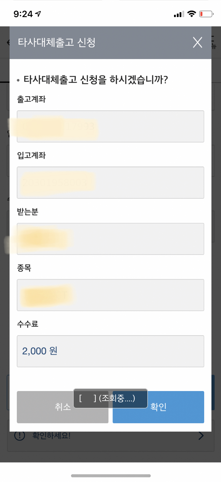 6. 조회가 되고, 입고계좌의 소유주의이름이 뜨고