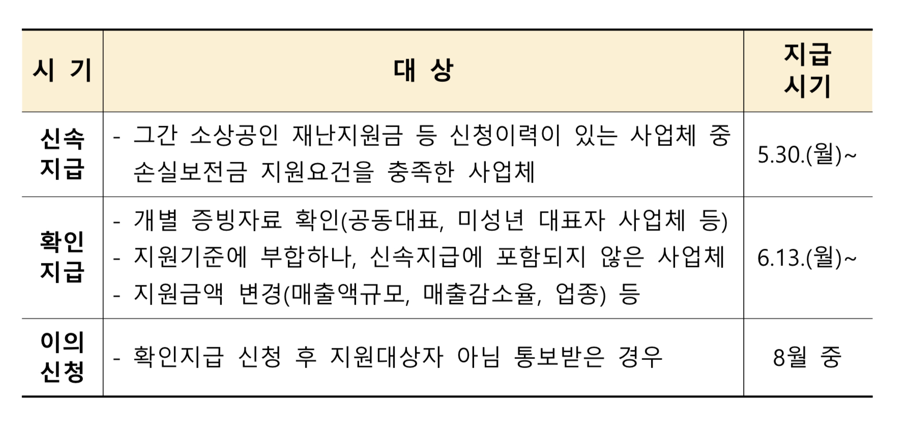 *신속지급 : 그간 소상공인 재난지원 등 신청이력이 있는 사업체 중 손실보전금 지원요건 충족한 대상자.