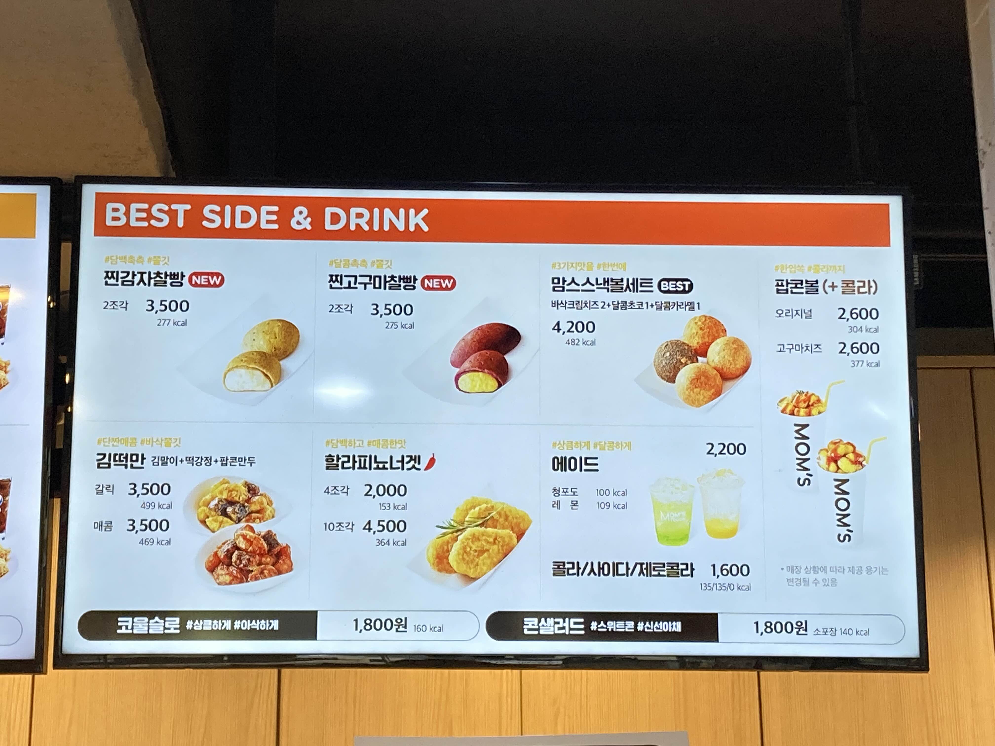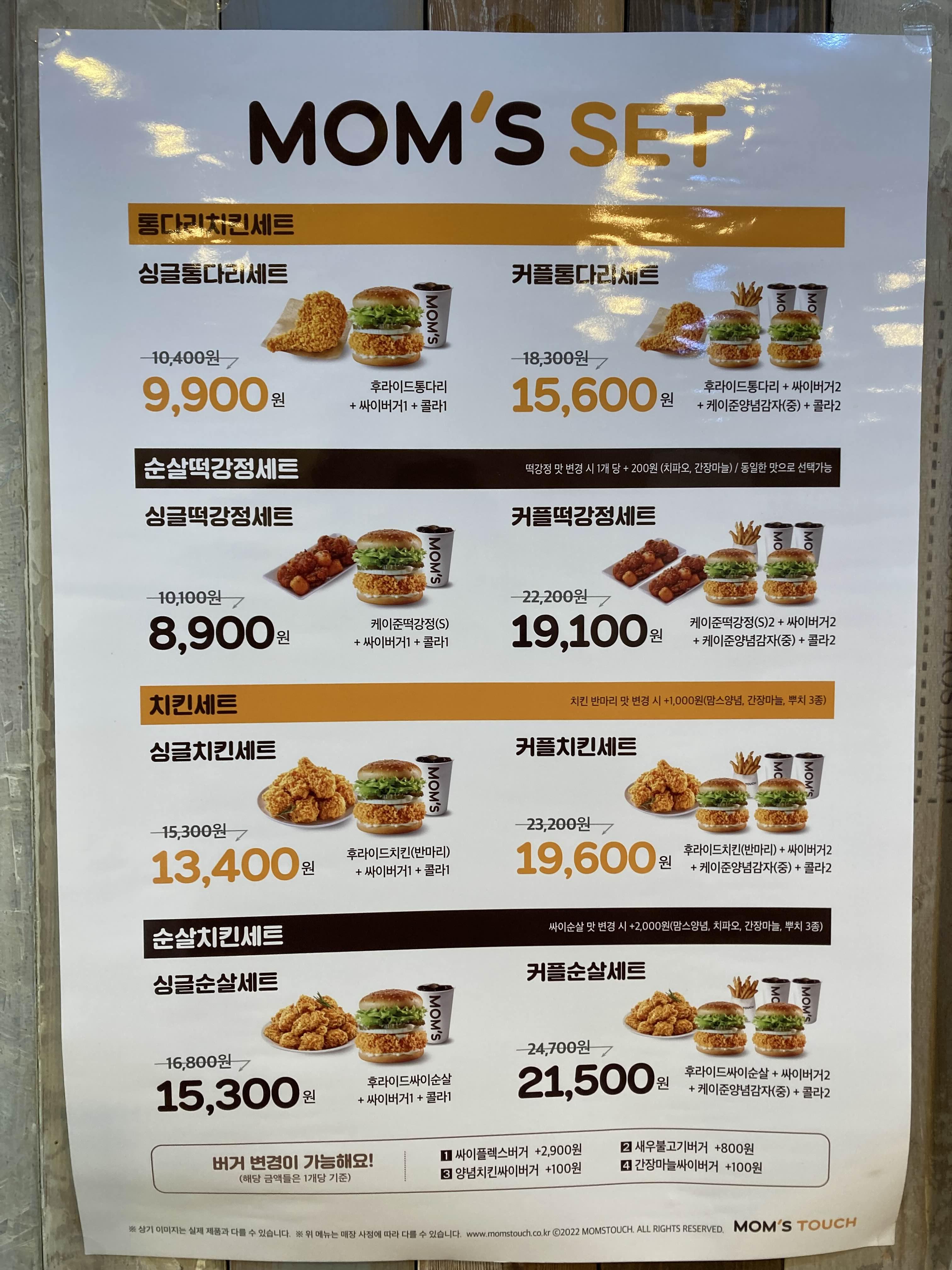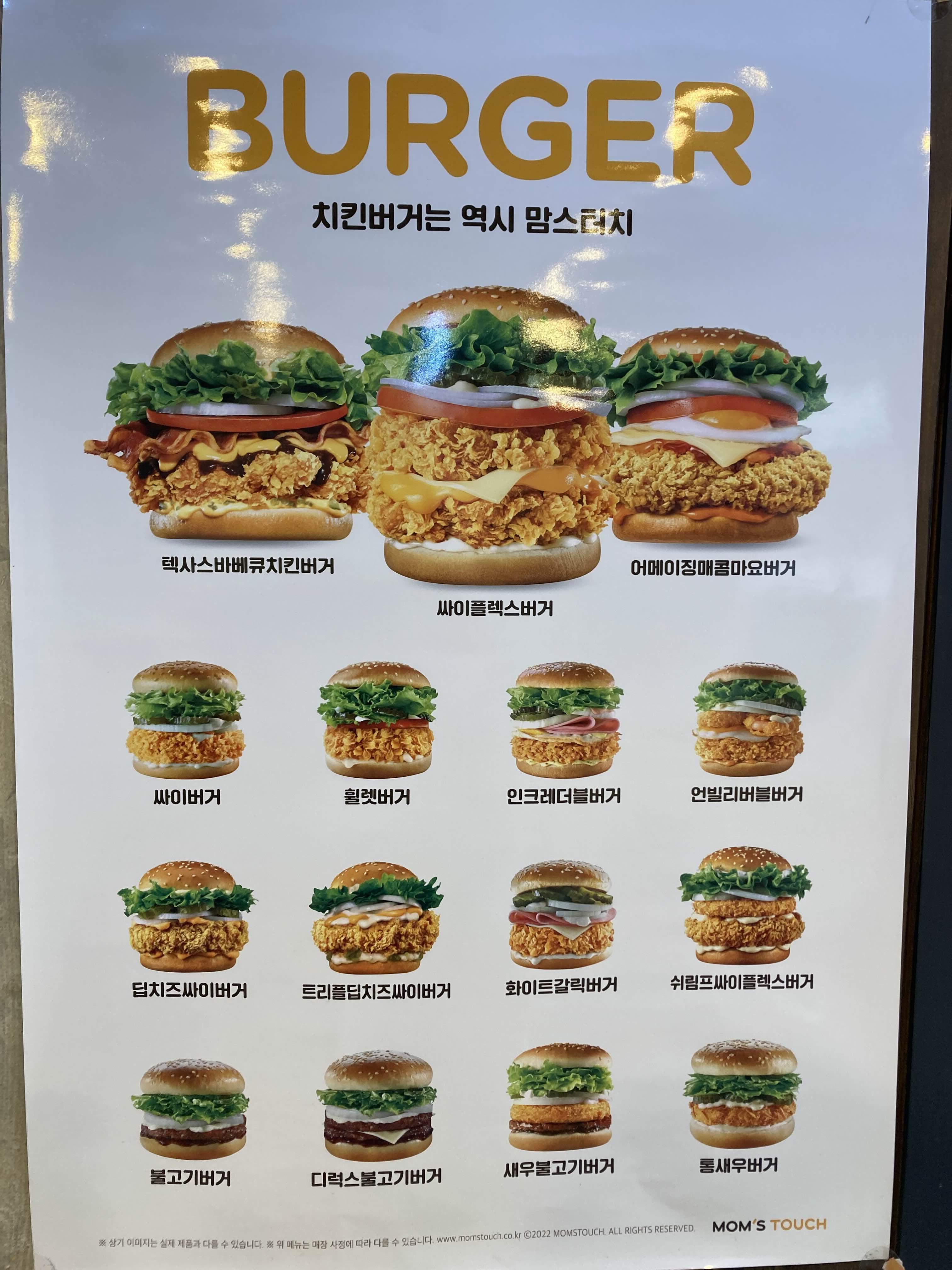 2022년 12월 7일 기준 맘스터치 메뉴판이에요